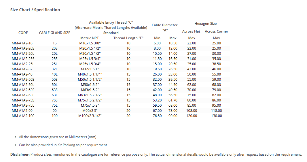 Gland Material: Brass (CuZn39Pb3), Stainless Steel (304 or 316L)