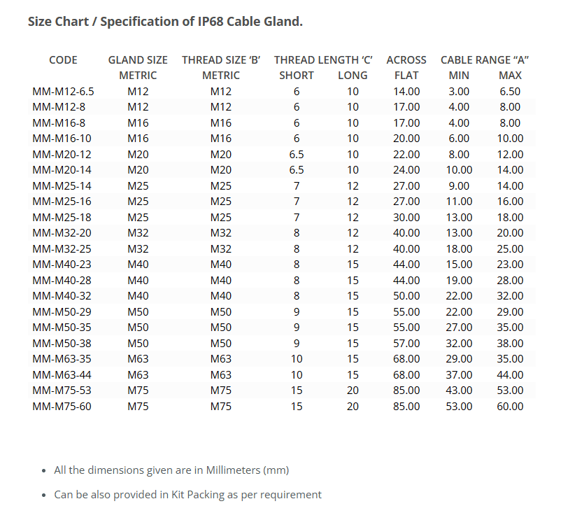 Type: IP 68 Metric Threaded Single Compression Cable Gland